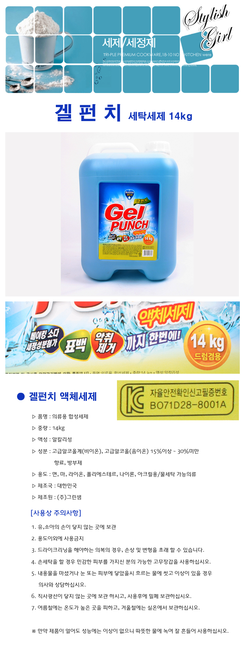 - 품명 및 모델명겔펀치 세탁액체세제 14kg(드럼겸용)