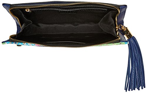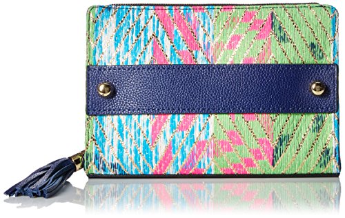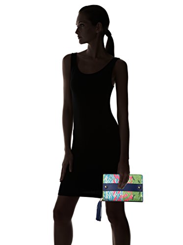 Collection tweed tassel clutch. Crafted in pebble leather with French tweed detail. Zip around closure with tassel zipper pull and front slide-through handle. Back pocket with signature MILLY hardware. Interior: one zip pocket and one slide pocket. Fully lined.