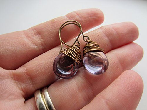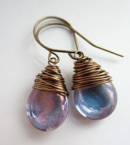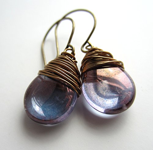 -. Title : Purple Wire Wrapped Earrings Czech Glass Drops Antiqued Brass Wire