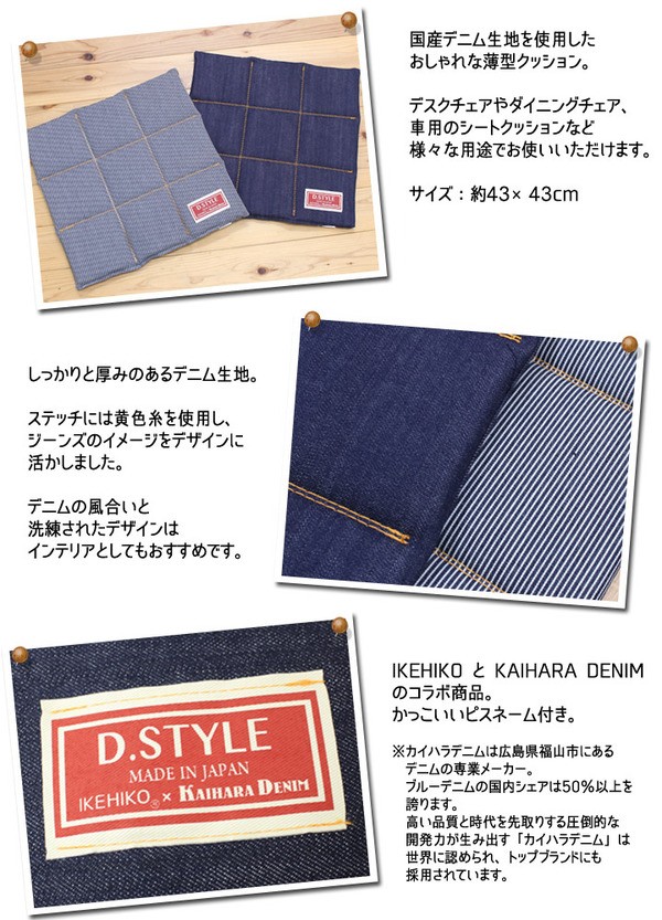 国産のデニムメーカーとコラボした、綿100%のクッションです。デニム生地を使用しているためお部屋の雰囲気を崩さず1つ置くだけでカジュアルでおしゃれなお部屋へと変身できます。カークッションとしてもご使用いただけます。汚れが気になる際は手洗いでお手入れができます。