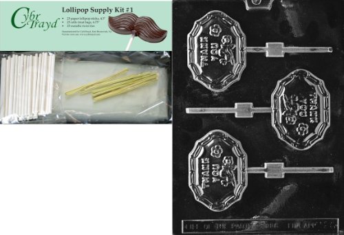 Cybrtrayd Thank You Lolly Miscellaneous Chocolate Candy Mold with Lollipop Supply Bundle of 25 Lollipop Sticks, 25 Cello Bags, 25 Gold Twist Ties and Instructions