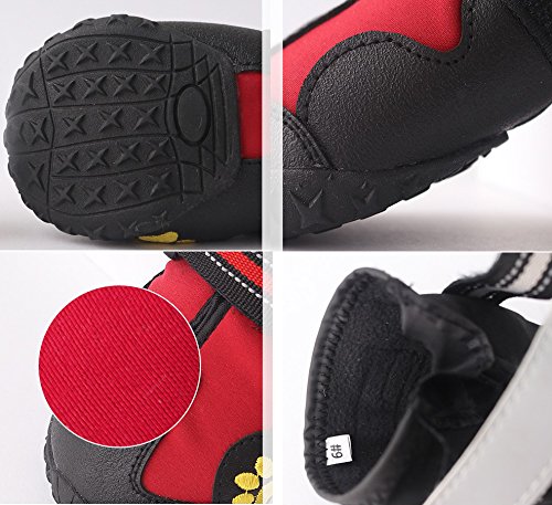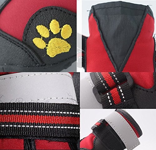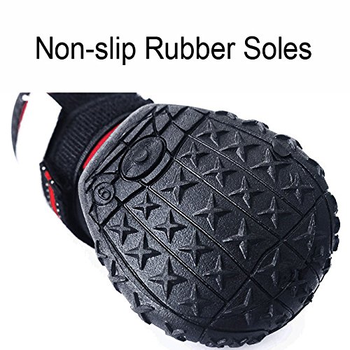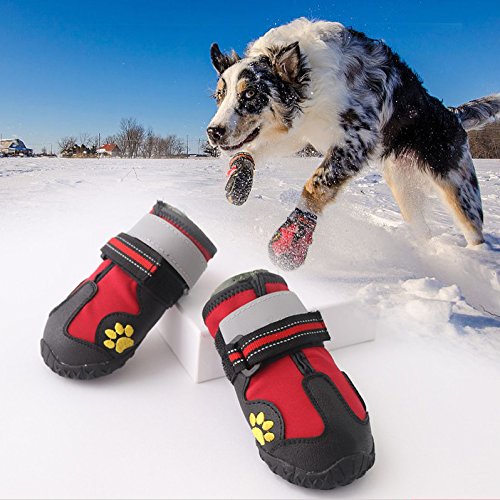 -. Feature : MEASURE: According to the size chart picture, measure your dogs right size and choose the suitable one. / RUGGED: Tough waterproof anti-slip sole provides stability and traction, protection from sharp thorns, hot pavement, salt during winter. / WATERPROOF: Keeps paw dry and warm, as rainy or snowy weather would not be a bother for you and your lovely dogs walking. Water resistant shoes keep paws dry and warm. No more wiping muddy or sandy paws after the rain or snow. Helps dogs with mobility and stability on tile and hardwood floors. / SECURE: Easy to put on / off. The shoe expands with a wide split seam opening and two adjustable and reflective velcro straps to ensure a tight fit and a safety walking in the night. / HIGH QUALITY: The dog boots have a rugged sole and high quality fabrics that are then sewn together to ensure they are ready for your adventure.