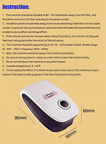 -. Feature : ★ Safe and easy to use: ultrasonic technology without harsh chemicals, nasty traps or unsafe fumes. Non-toxic, environment-friendly, safe and odorless. Just plug it into socket / ★ Each pest repeller covers 80 - 120sq ft, ideal for room, Indoor, Kitchen,, office, garage, home or Store, Simply plug it in and it gets to work / ★ Versatile repellent: keep a wide range insects & rodents away from inside your home such as Flies, Moths, Cockroaches, Rats and Mice, and Many More, let home safty / ★ Applied occasions: wheat flour processing factory & food processing factory & rice mills & pharmaceutical factory & feed mills & granary that can not be used poison bait or pesticide, theatre & restaurant & supermarket & department store & hotel & hospital that was troubled by pest pollution, grocery & clothing store & food store & furniture store that always encounters pest, villa & home & air conditioning bedroom & canteen of institutions & storeroom / ★ Material: ABS; Size: length 3.5inch * width 2.2inch * height 1.2inch; Usage: plug in. */* Attention: effect of expelling ants is generally because ants are live in the deep underground and activity frequently, maybe sonic wave can't reach, please understand