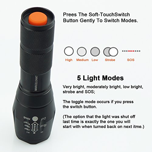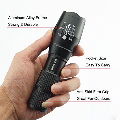 Marceloant Super Bright Tactical Flashlight, XML-T6 LED Zoomable Adjustable Focus 5 Modes Water Resistant Torch With Rechargeable 2 X 18650 3200mAh Battery & Charger