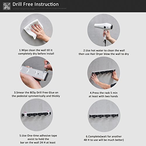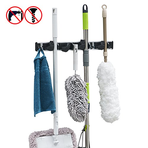 BESy No Drill Mop and Broom Holder Self Adhesive, 4 Grips with 5 Hooks Garage Storage Holds Up to 9 Tools, Heavy Duty Storage Solutions, Garage Storage Systems Broom Organizer,Wall Mounted, Black
