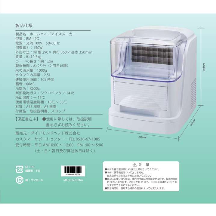 ●製氷時間:初回35分(2回目から25分で出来上がります)