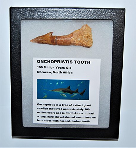 Studio : Fossils, Meteorites, More Publisher : Fossils, Meteorites, More Binding : Toy Product Description This is a neat tooth from the giant prehistoric fish, ONCHOPRISTIS. This tooth measures 2.952 inches long. The Onchopristis fish lived during the Upper Cretaceous time period approximately 100 million years ago! Included with the tooth is a nice color information card and glass-topped display box. This fossil was found in Morocco, North Africa. It is a unique and interesting piece!We have a variety of onchopristis teeth of various sizes and qualities so check out our other items! 0