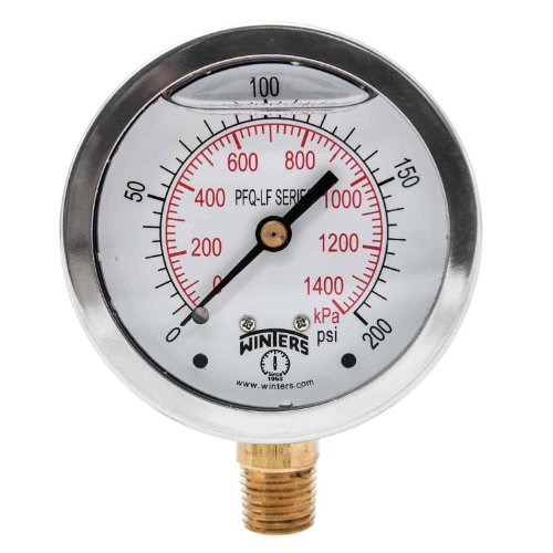 Winters PFQ806LF PFQ-LF Series Pressure Gauge, 2.5" Dial size, 1/4" NPT, 0/200 psi/kpa, Glycerin Filled