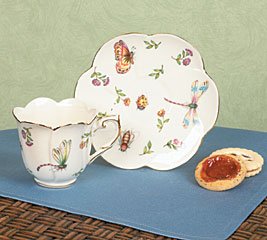 -. Feature : Porcelain teacup and saucer set / Beautiful butterfly pattern / 5 oz cup with scalloped rim / FDA approved/Hand washing recommended / Gift boxed