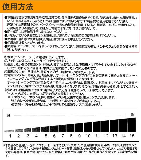 EMS(ElectricalMuscleStimulation)で1分間にMAX1000回筋肉を刺激。約23分間のオートトレーニングプログラムでテレビを見ながら、ゲームをしながら、お友達とおしゃべりしながらでもご使用いただけます!!ボタン一つで簡単に操作でき、コードレスだから邪魔にもなりません!!また、15段階刺激調整で運動効果に合わせた設定が可能となっております。 |