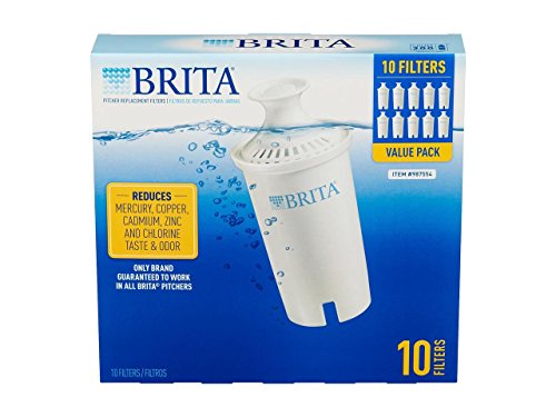Studio : Brita Publisher : Brita Product Description Improve the taste of tap water by regularly changing your BPA-free Brita® Advanced Replacement Filter. Designed to fit all Brita® pitchers and dispensers, this filter reduces the taste and odor of chlorine to deliver great-tasting water while removing copper, cadmium and mercury that may be in your tap water. For optimum performance, change your water filter every 40 gallons, or approximately 2 months. One water filter can replace up to 300 standard 16.9-ounce water bottles, better for the environment and for your wallet. Keep the great-tasting water flowing with this convenient pack of 10 filters. Get great taste, less waste and more savings from Brita®. Brita Advanced Replacement Filters can be used on ALL Brita Pour-Through Pitchers (Pitcher not included), and the convenient electronic filter indicator on the Pitcher will remind you when it's time to change your Brita Filter. Features: Set Includes: 10-pack Brita replacement filters for use with all Brita® Pour-Through Pitchers (Pitcher sold separately) Reduces taste and odor of chlorine to deliver great tasting water Reduces substances such as copper, cadmium and mercury that may be in your tap water Reduces sediment and water hardness Quick and easy to change filter; requires no pre-soaking No black flecks For best performance change water filter every 40 gallons or 2 months 1 water filter can replace 300 standard 16.9 ounce water bottles Country of Origin: Canada 0