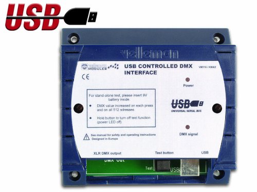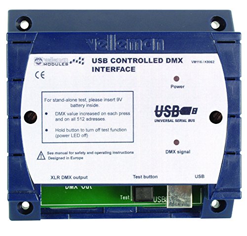 Studio : Velleman Publisher : Velleman Binding : Misc. Product Description VELLEMAN VM116 USB Controlled DMX Interface, Factory Assembled Tested.This unit can control DMX fixtures using a PC and USB interface. Test software and "DMX Light Player" software is included, a DLL is provided to write your own software, furthermore there is a stand-alone test function that outputs all 512 channels at a time, with adjustable levels. 0