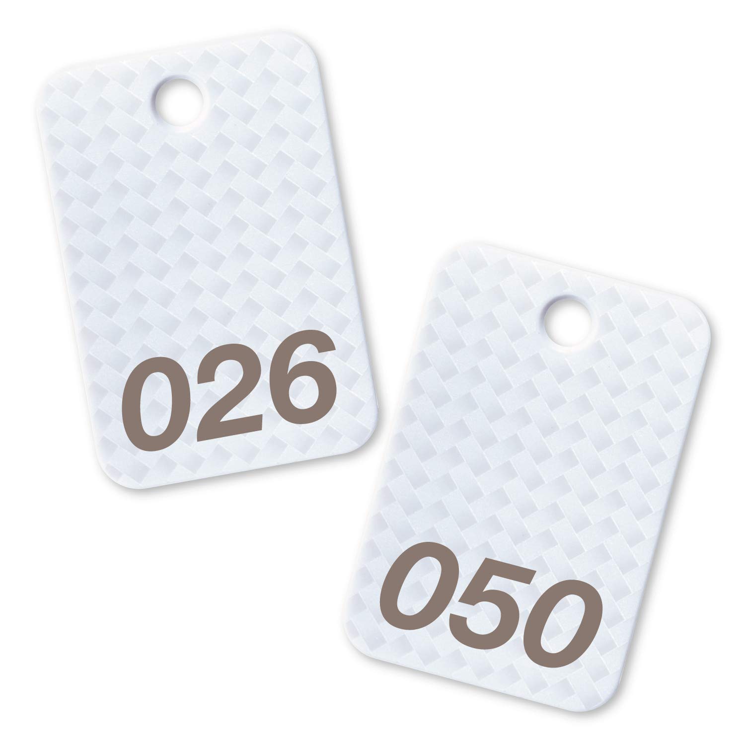 高級感のある網目柄の角型番号札 荷物のお預かりや順番待ちの整理券として使用できます。 【サイズ】W40×D60×H2.7 【穴径】約6.5mm 【入り数】25枚 【内容】番号札26~50 【材質】再生PS 【生産国】日本