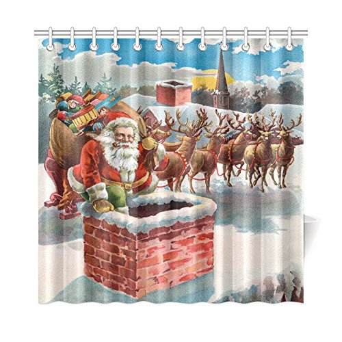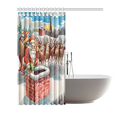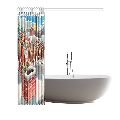 InterestPrint Merry Christmas Home Decor, Vintage Santa Claus Reindeer and Sleigh on the Roof Top Polyester Fabric Shower Curtain Bathroom Sets with Hooks 72 X 72 Inches
