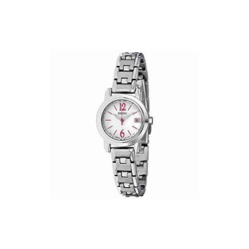 Stainless steel case measures 29m diameter by 9mm thick.Brushed and polished link bracelet secures the timepiece to your wrist.Classic white tone dial compliments the purple hands and markers.The scratch resistant Hardlex crystal protects the precise Quartz movement.Water resistant to 100 meters.