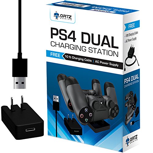 Longer Cable, 10 Ft. This accessory model includes a longer 10 ft. cable that makes charging your controllers much easier. You no longer have to be restrained by a wall power outlet, crouching desperately in a corner of your bedroom. The Ortz PS4 controllers charging dock cable makes it possible to charge your device while playing Grand Theft Auto V or Dragon Age from the other corner of the room.