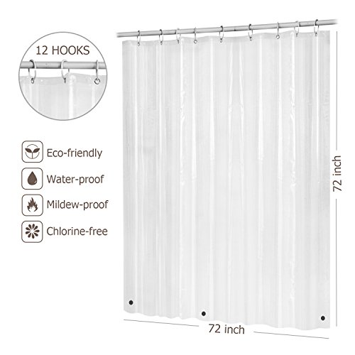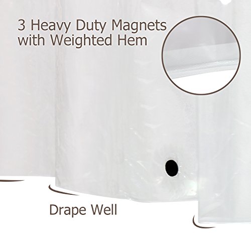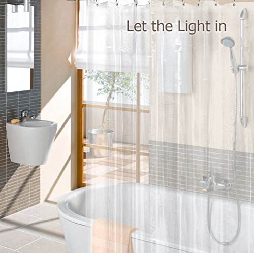 12 Rustproof metal grommets and reinforced mesh header add more durability into this completely transparent shower curtain liner.