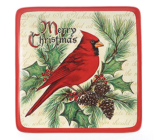 - Dishwasher safe/FDA approved/Microwave safe. Ceramic square shape plate with red cardinal perched on pine branch with holly and berries. Merry Christmas in faint wording.