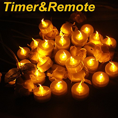 Topstone Pack of 24 LED Tealight Candles Powered by Long Lasting CR2450 Battery,Realistic Amber Flickering Bulb,Fake Candles with Remote Control and 4H 6H 8H Timer for Seasonal &Festival Celebration