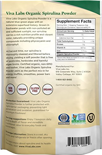 -. Binding : Misc. -. Brand : Viva Labs -. EAN : 0753940520502 -. Feature : SUPPORTS HEALTHY AGING - Viva Labs Organic Spirulina Powder is a concentrated blue-green algae that provides vitamins, minerals and essential fatty acids for the maintenance of healthy looking skin. Fight the signs of aging with our powerful superfood! / ALKALIZES FROM WITHIN - As a natural detoxifier, our spirulina powder naturally boosts alkalinity from the inside out. pH balance is essential for everyday cellular health, including digestive function, immunity and a healthy inflammatory response. / BOOSTS METABOLISM - Our spirulina powder provides essential vitamins and minerals to encourage a healthy metabolism, supporting healthy weight management and energy levels. Add a teaspoon to your morning routine to boost metabolism all day long! / SUPPORTS EVERYDAY WELLNESS - Viva Labs' spirulina provides a vegan source of dietary protein, in addition to supporting sufficient levels of vitamin A, iron, B vitamins and more. / PURITY GUARANTEED - Our spirulina grows in freshwater ponds with full sunlight for the highest levels of powerful compounds and nutrients. Certified organic, non-GMO and kosher, each batch is guaranteed to be free of impurities! -. IsAdultProduct : 0 -. Label : Viva Labs -. Manufacturer : Viva Labs -. ProductGroup : Grocery -. ProductTypeName : GROCERY -. Publisher : Viva Labs -. Studio : Viva Labs -. Title : Viva Labs Organic Spirulina Powder- The FINEST Green Superfood, Boost Energy Naturally, Non-GMO,16 oz. -. UPC : 753940520502