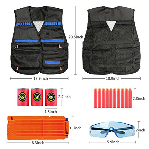 -. Feature : ★1. Tactical Vest Kit Fully Armed with lots of Extra Firepower for Nerf Guns: You will not only get a Elover tactical vest, but also lots of useful items for your Nerf guns, including 40pcs darts(blue, red each 20pcs darts) A cool protective flexible glasses, one 12-darts quick reload clips, also one modern face tube mask, 2 hand wrist band and 12 EVA target buckets. Maximize your firepower. / ★2. A Must Have Tactical Vest Kits for Crazy Nerf Fan: The tactical vest has 4 adjustable strips, also the hand wrist bands can be adjusted to fit most sizes. The glasses are flexible and soft, protects you in the game and gives you the sharp look of a serious competitor. / ★3. Comfortable and Adjustable Vest : Made of safety high quality material. Enjoy a sturdy, durable vest that is also breathable! No smell, easy to wash. The protective glasses are made of environment-friendly PC material, no harm to eyes. Darts are soft, very safety when play with partners, fit for Nerf guns N-Strike Elite Series, no worry about falling out from your Nerf guns. / ★4. Modern and Technical: Wearing the vest, glasses, and face tube mask, make you looks more like a hero in the fight. And you can design the shape of your mask for different role in your dream. The quick reload clips make you have strong firepower, absolutely will win in the fight ! / ★5. Warranty and Money-back Guarantee: You will definitely impressed by our tactical vest set for nerf. We offer lift-time quality warranty and full refund just in case you don't like it. Please feel free to contact us if you have any problems, we will surely help you.