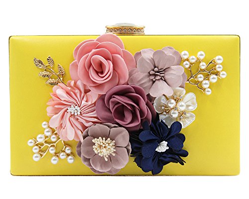 Spring look satin floral attached, and pearls beaded detail, big crystal clip top, there is a metal snap on the top of the bag to keep things away from falling out.
