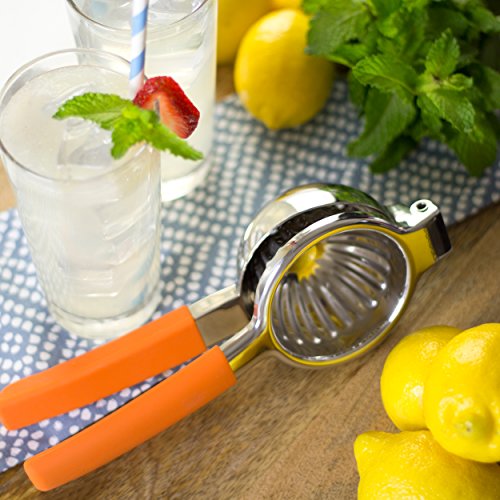 - EXTRA BIG AND EXTRA WIDE - JUMBO SIZE: We have made this in JUMBO size with extra wide bowl to easily squeeze even more juice out of the lemons, limes and mandarins. Silicon handle covers in orange make it easy to find in the pile of kitchen utensils.