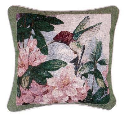 Hummingbird Garden Decorative Tapestry Toss Pillow. Beautiful design featuring a hummingbird enjoying a colorful snack in a garden of pink flowers. Wonderful detail and colors. Measures 17"x17". Front: 60% Cotton/40% Polyester; Back: 70% Polyester/30% Cotton; Filling: 100% Polyester; Spot or dry clean only. Matching tapestry throw blanket available. Made in the USA. Hummingbird Garden by artist Carolyn Shores Wright pillow makes a thoughtful birthday or anytime gift!