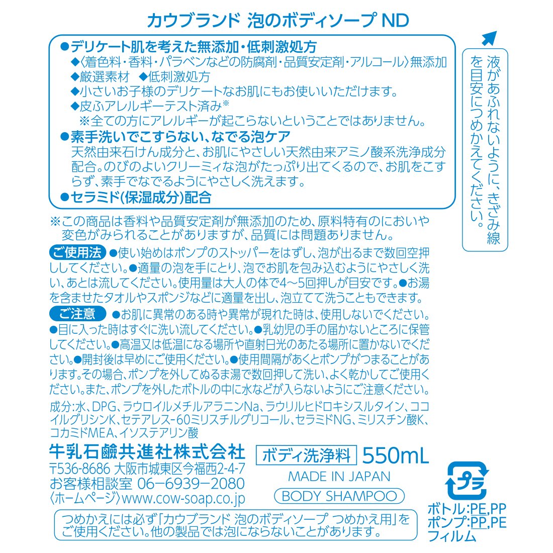 "Cow brand-free added foam body soap 550 ml" is a bubble body soap containing a vegetable amino acid based cleaning component.