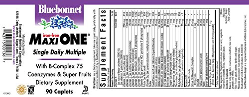 Bluebonnet's Maxi One Formula is a higher potency, single daily, multivitamin and multi-mineral dietary supplement in a caplet and is formulated with highly efficient patented Albion chelated minerals and popular carotenoids, such as natural beta-carotene and Flora GLO lutein from 100% natural marigold extract. For individuals concerned with iron consumption, this product is iron free.Feature