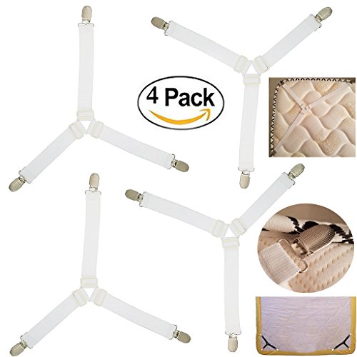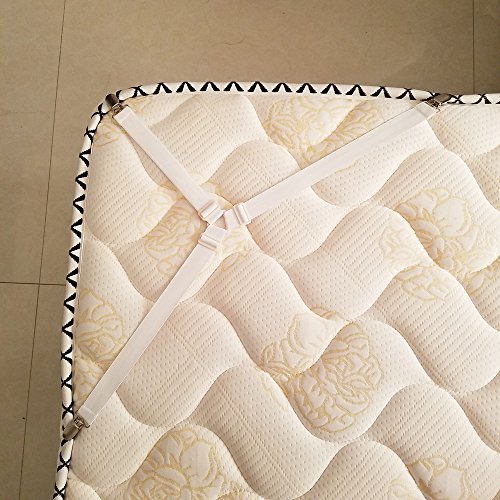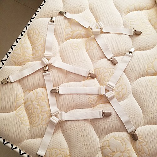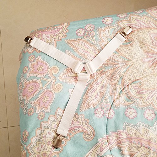 Product Description About the product - Our Sheet Fasteners is built in plastic clenching system protects fabric from harm. - Sheet suspenders are built with durable round elastic, nickel plated clamps with fabric protector and unique heavy duty bungee cord lock. - It's easy to put on and keeps sheets in place and no more fixing sheets, adjustable length allows desired tension. - These bed sheet straps fit to fitted or flat sheets on different type of beds such as standard size, odd shaped beds, foam beds, pillow top beds, air mattresses, RV's and travel trailers and more. - Use cover fasteners and never worry about messy or wrinkled sheets again, eliminate the slipping of any bed sheets with these sheet fasteners. - Other uses: tablecloths covers, grill covers, cars seat cover, boats seat cover, motorcycle seat cover, scooters seat cover, couch seat cover, chairs seat cover and more. Include Set of 4 bed sheet grippers suspenders straps clips 0