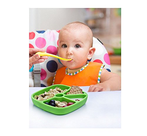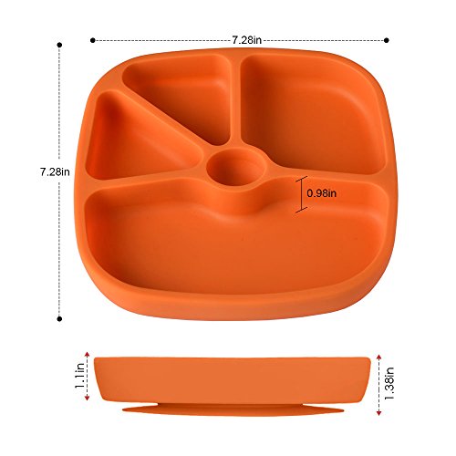 -. Feature : Food-Grade Silicone Material: PVC, phthalate free, the kids silicone plate Conforms to the FDA quality. Eco Friendly 100% Food Grade Silicone standard and BPA free are all for kids. / Upgraded Super Strong Suction Base: The bottom of the product is upgraded with a great sucker to prevent the plate being lifted off that you do not worry about made a mess by your kids. Once you put it on the surface of the desk,the kids can not easily pull it off / Humanized Design: Great for little kids learning to self-feed, with more practical and reasonable divisions, is perfectly sized for toddler portions. / Idea Size :Fits most high chair trays, measuring approximately7.28" length, 7.28" width, and 1.1" deep. It is a reasonable size,with a large capacity. it is also a portable thing,we offer a free premium bag for conveniently travelling use or dinning the restaurant. / Dishwasher, Freezer, Microwave Safe. Parenting is actually a very hard but great work, so we strive to make baby mealtime as easy as possible. It is a must-have baby silicone suction plate,your babies will love it very much.
