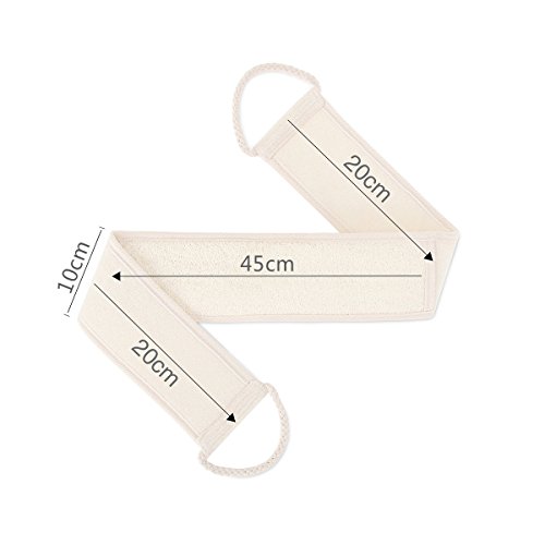 - EASY AND COMFORTABLE – 34 x 8 inch (include 18 x 4 inch large loofah area) is perfect size for men and women. You no longer have to bend and reach awkwardly to clean your back. The scrubber won't roll, fold, or twist during use as can happen with narrower back straps. Convenient handle on each end makes it easy to give your back the attention it deserves.