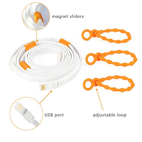 it is USB-powered and you could carry it around to illuminate your path by plugging it into a USB power bank(not included). It comes with 3 universal rubber loops to attach the light strip to tent poles, branches and it also has slidable built-in magnets to attach to any metal objects. At one end of the line there is a utility loop to hang the light in place.