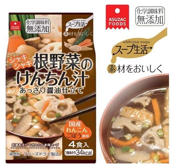 | サイズ | 個装サイズ:46×15×12cm | </t食べたいときにすぐにできるのに味は本格派!!シャキシャキの歯ごたえが楽しめる根野菜をつかったあっさり醤油味のけんちん汁です。香りのよい国産ごぼうに、シャキシャキのレンコン、ふっくらした油揚げ、彩りの人参・わけぎ、香りの白ゴマが入りました。上品なあご出汁にごま油をきかせ、風味豊かに仕上げました。 製造国:日本 仕様:・フリーズドライ製法・化学調味料無添加 セット内容:35.2g(8.8g×4食)×10袋 賞味期間:360日 名称:乾燥スープ ※サプライヤー直送品 ※2019年1月22日入荷分予約受付中【商品名】アスザックフーズ スープ生活 根野菜のけんちん汁 35.2g(8.8g×4食)×10袋
