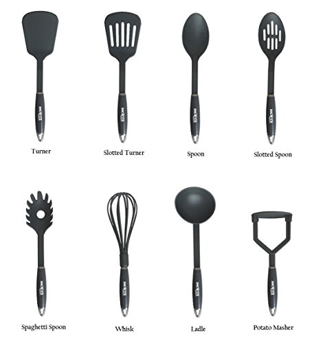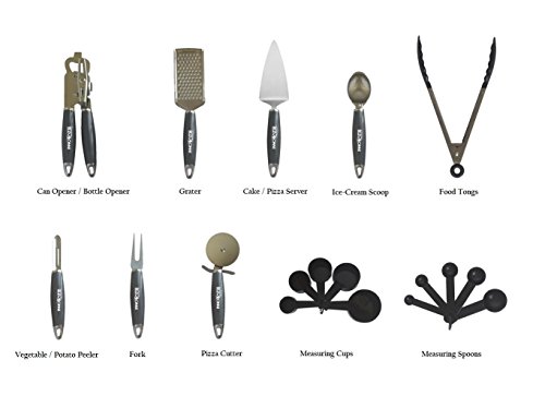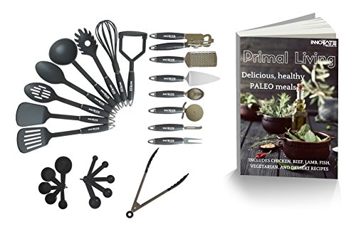 -. Feature : The ULTIMATE UTENSIL SET - Not your standard black and silver tools and gadgets. Offers a wide range and varied selection of eco-friendly accessories that are stylish, light weight, easy to clean and easy to carry with BPA free easy-grip dark gray handles that will set you apart from your friends. / The HIGH-QUALITY KITCHEN TOOLS available in this kitchenware are FDA approved, non-toxic, anti-dust, non-sticking and safe for your cookware, bakeware and dishwasher. The nylon pieces are also non-stick, and are heat resistant up to 410 °F / 210 °C. / Consists of BOTH NYLON & STAINLESS STEEL, including, Spoon, Slotted Spoon, Ladle, Spaghetti Spoon, Turner, Slotted Turner, Whisk, Potato Masher, Pizza Cutter, Cheese Grater, Cake Lifter / Pizza Lifter, Vegetable / Potato Peeler, Bottle & Can Opener, Ice-Cream Spoon, Fork, Food Tongs, 5 x Plastic (PP) Measuring Cups (1 Cup, ½ Cup, ⅓ Cup, ⅟4 Cup, ⅛ Cup) and 5 x Plastic (PP) Measuring Spoons (1 tbsp, ½ tbsp, 1 tsp, ½ tsp, ⅟4 tsp). / E-RECIPE BOOK is included in your purchase. Use them to whip up these easy to make, healthy, and delicious recipes for your family. / An IDEAL STARTER for new homeowners, or a birthday or Christmas gift. Innovate Products guarantees your satisfaction, and if you are not entirely satisfied with your purchase, please don't hesitate to contact us for a 100% money back or replacement guarantee.