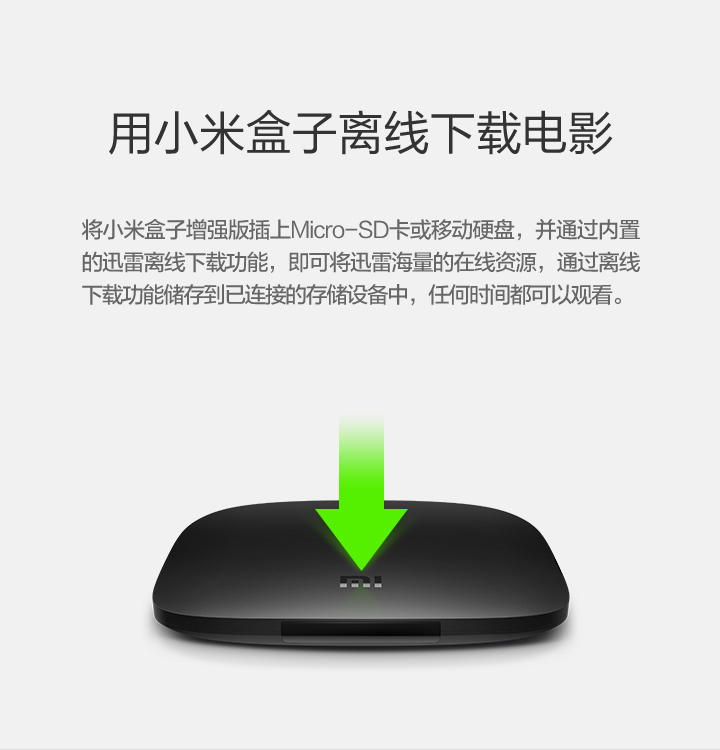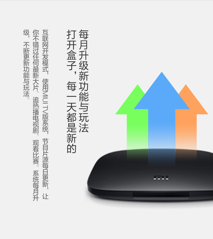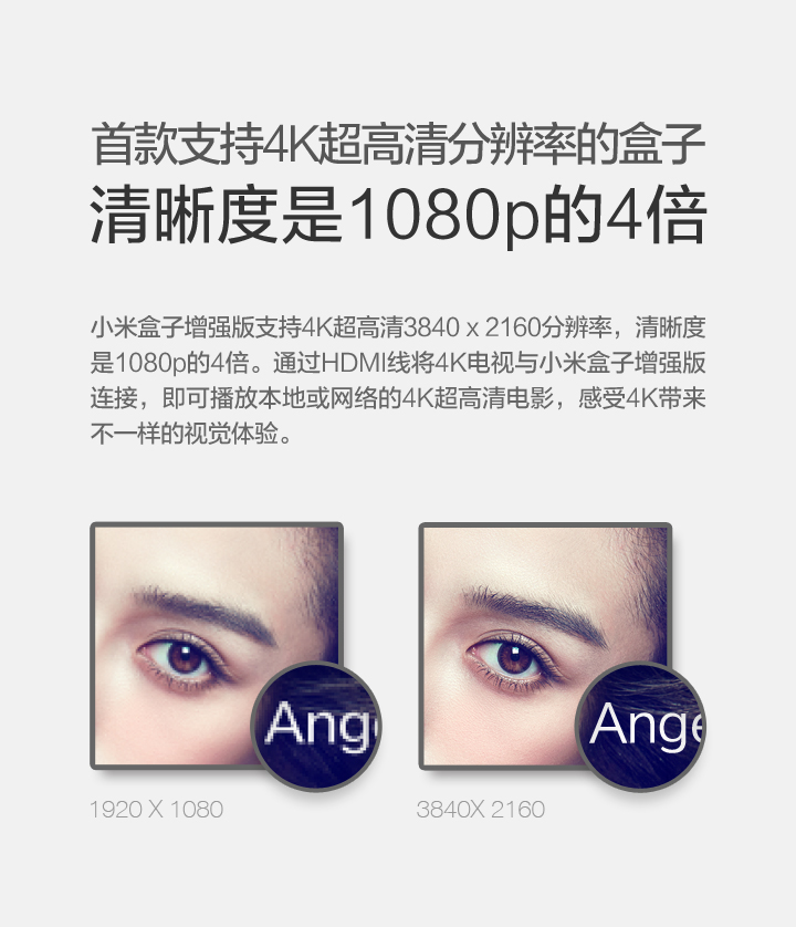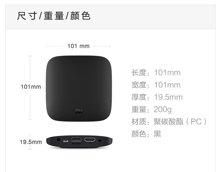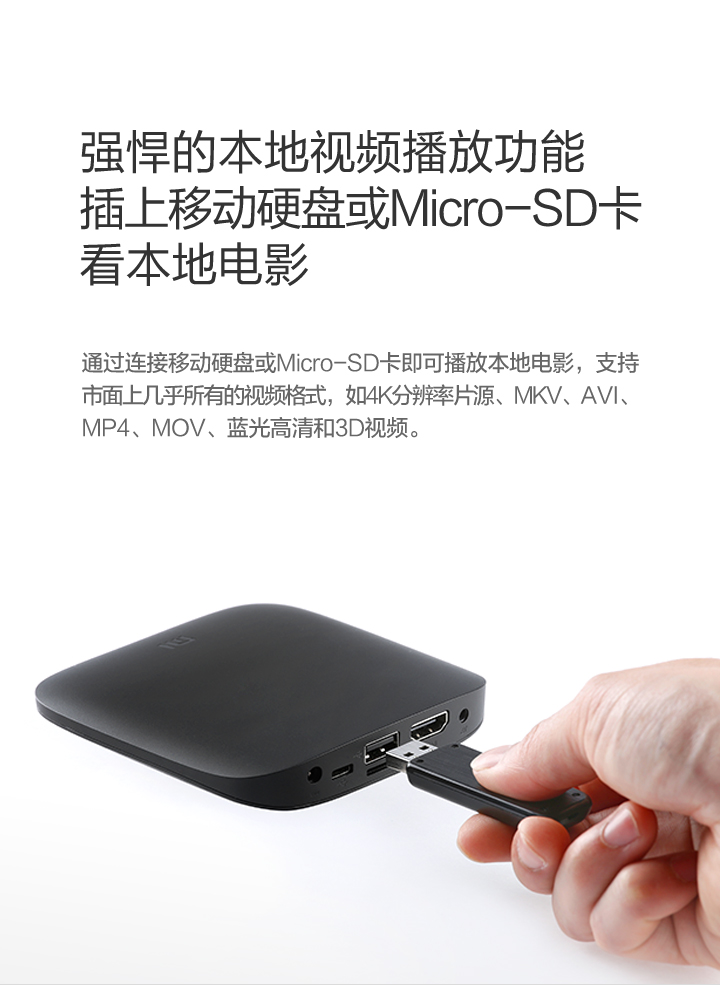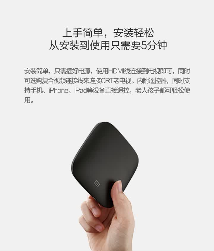 Details: Resolution | 4K (3840X2160) | Processor, GPU, Memory, Storage, Wireless | Cortex-A9, 2.0 GHz CPU Mali-450, 600MHz 1GB DDR3 4GB eMMC Bluetooth 4.0 | OS | Google CTS certified MIUI TV based on Android 4.4 | Video Formats | H.264, VC-1, WMV-HD, MPEG1/2/4 up to 1080P@30FPS; real7/8/9 up to 720P@30FPS RM, FLV, MOV, VOB, AVI, MKV, TS, WMV, MP4 3D display capable | Audio Formats | MP3 64kbps~320kbps, WMA 64kbps~320kbps, APE/Flac≤1500Kbp MP3, WMA, APE, Flac Dolby Digital Plus, DTS | Picture Formats | JPG,BMP,GIF,PNG | Language | Chinese | Ports and Interfaces | Micro-USB RJ45 Ethernet HDMI 1.4 3.5mm jack with SPDIF support | Wireless | 2.4GHz/5GHz 802.11a/b/g/n Bluetooth 4.0 | Color | Black | Remote | IR remote and cellphone remote support | In the Box | IR remote control, HDMI cable、instructions、warranty papers | | |