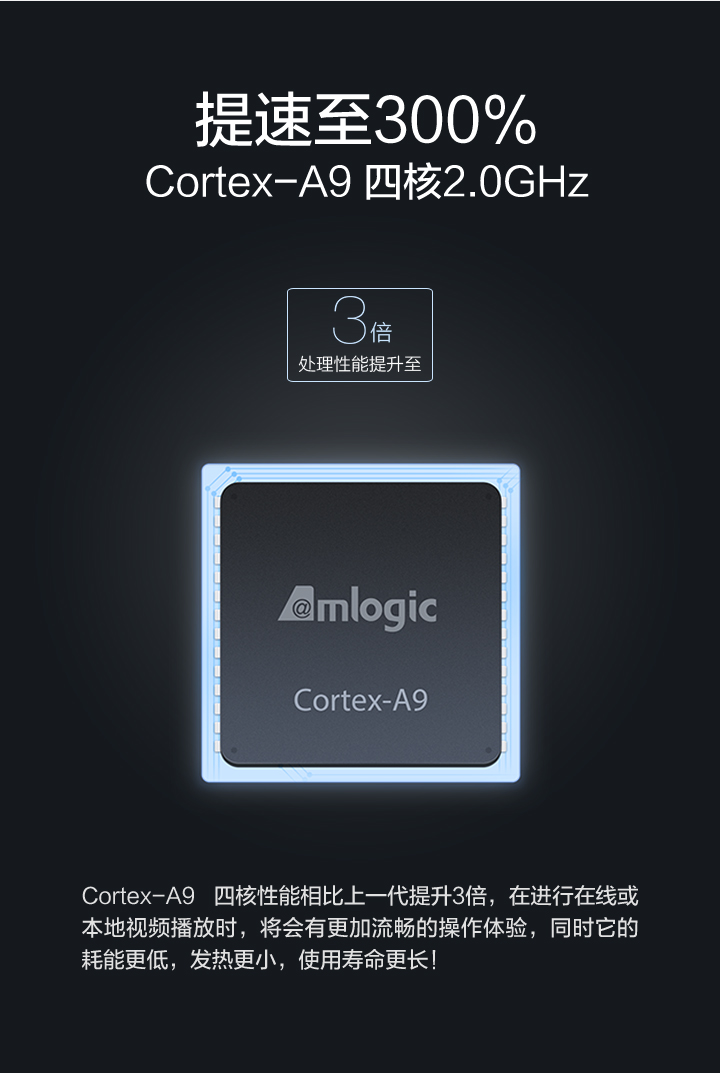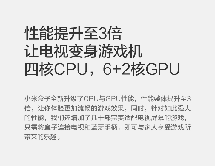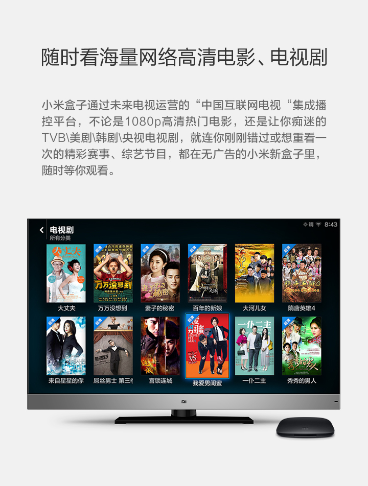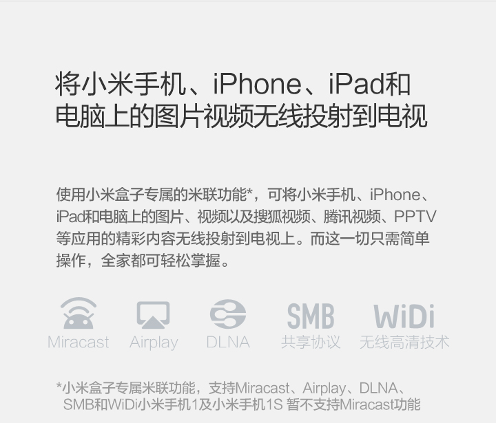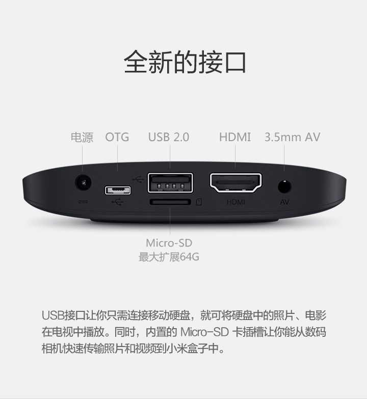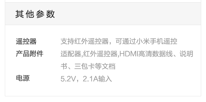 Details: Resolution | 4K (3840X2160) | Processor, GPU, Memory, Storage, Wireless | Cortex-A9, 2.0 GHz CPU Mali-450, 600MHz 1GB DDR3 4GB eMMC Bluetooth 4.0 | OS | Google CTS certified MIUI TV based on Android 4.4 | Video Formats | H.264, VC-1, WMV-HD, MPEG1/2/4 up to 1080P@30FPS; real7/8/9 up to 720P@30FPS RM, FLV, MOV, VOB, AVI, MKV, TS, WMV, MP4 3D display capable | Audio Formats | MP3 64kbps~320kbps, WMA 64kbps~320kbps, APE/Flac≤1500Kbp MP3, WMA, APE, Flac Dolby Digital Plus, DTS | Picture Formats | JPG,BMP,GIF,PNG | Language | Chinese | Ports and Interfaces | Micro-USB RJ45 Ethernet HDMI 1.4 3.5mm jack with SPDIF support | Wireless | 2.4GHz/5GHz 802.11a/b/g/n Bluetooth 4.0 | Color | Black | Remote | IR remote and cellphone remote support | In the Box | IR remote control, HDMI cable、instructions、warranty papers | | |