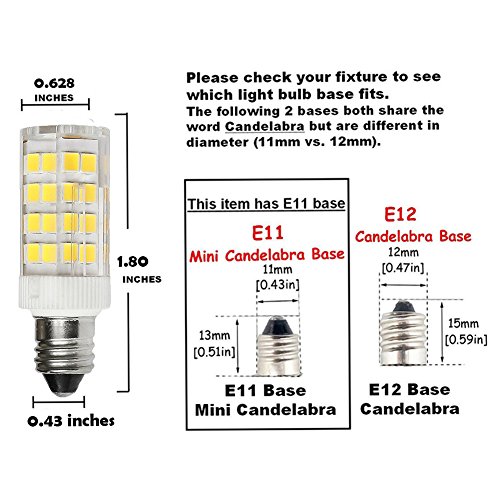 - ATTENTIONS: 1. E11 BASE , not e12 base, please make sure you light fixture base before purchase. 2.COLOR: Maybe Soft White will be better for you b. 3. About 350lm ,Equivalent Max 35 WATT JD E11 halogen bulb,may not bright as e11 halogen bulb.4. Make sure NO POWER at all , It's will be light up when there are a just a minimal amount of power in circuit will make this led bulb keep a weak light even if the power it’s turn off.