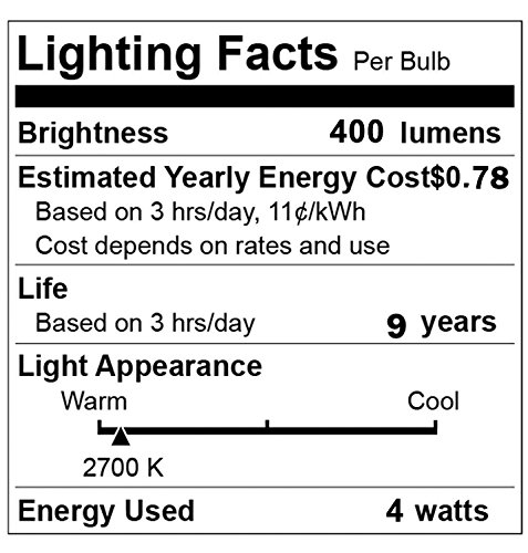- Super Eco-friendly & Big Saving: 4W LED = 40W Incandescent Equivalent. Operating cost per year: $ 0.72 /Bulb, which saving 90% on your electricity bill.