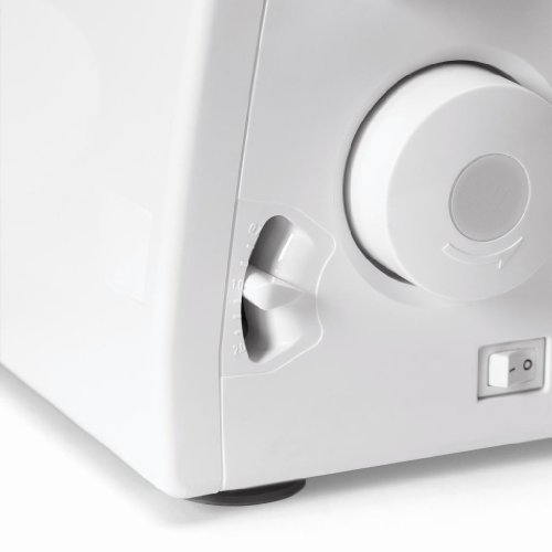 -. Feature : Two-needle sewing machine with speeds up to 1,300 stitches per minute / Differential feed for versatility; color-coded threading; easy tension adjustment / Adjustable stitch width (3.0 to 6.7 mm) and stitch length (2.0 to 4.0 mm) / Easy conversion to free-arm sewing; built-in accessory storage / Measures approximately 15 by 13 by 12-2/7 inches; 25-year limited warranty. 110 volt machine designed for United States and Canadian use only.