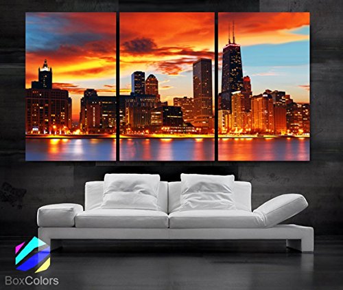 -. Title : Large 30"x 60" 3 Panels 30"x20" Ea Art Canvas P.R.Int Beautiful Chicago Skyline Sunset Light Wall Home (Included Framed 1.5" Depth)