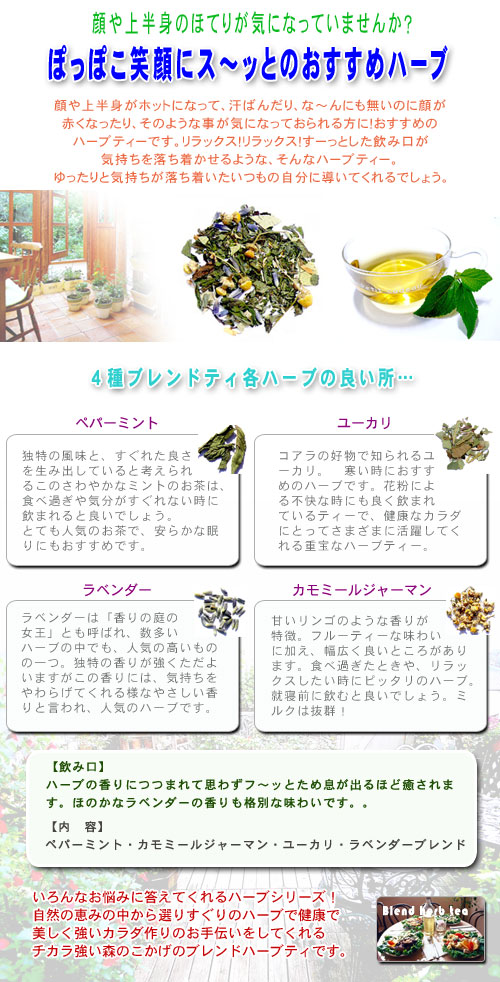 | 上半身のほてりが気になっていませんか? | | 上半身のほてりで汗ばんだり赤くなったり、そのような症状が気になっておられる方におすすめのハーブティーです。優しく解きほぐし、リラックス。落ち着かせ、いつもの自分に導いてくれるでしょう。 | 【内容】 ペパーミント・カモミールジャーマン・ユーカリ・ラベンダーブレンド |