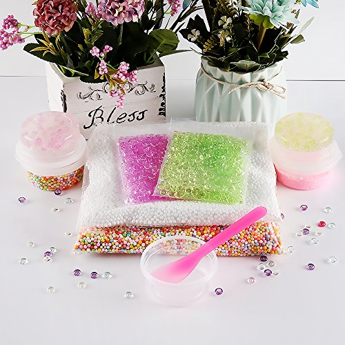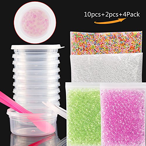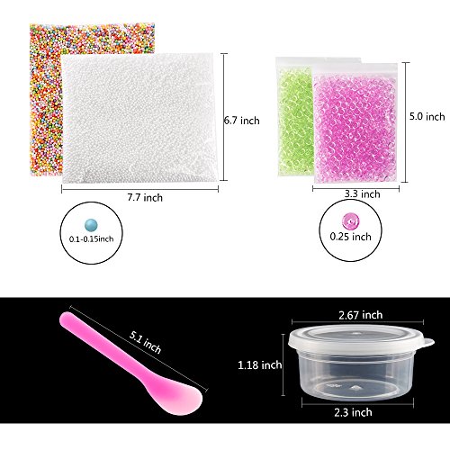 - Slime-making kit: comes with 2 pack fishbowl beads 1.76oz/50g per pack – purple and green, 2 pack foam beads-mixed color and white, 10 pieces clear Slime containers, 2 pieces slime mixing spoons