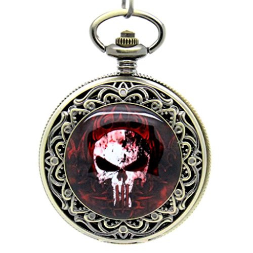 -. Feature : Quartz pocket watch / Bronze chain and case / Unique skull image cover / One side open pocket watch / Retro Style