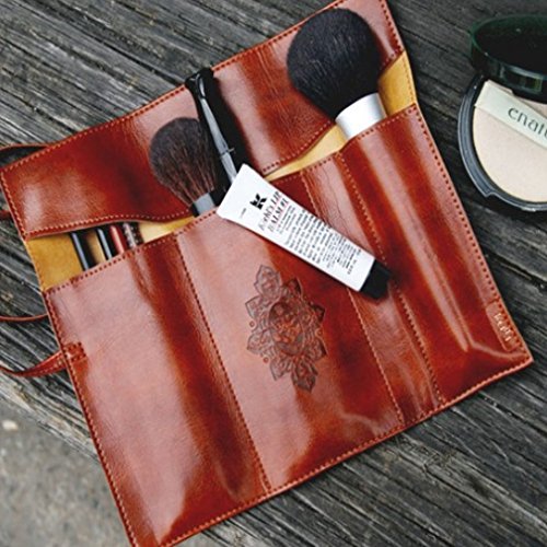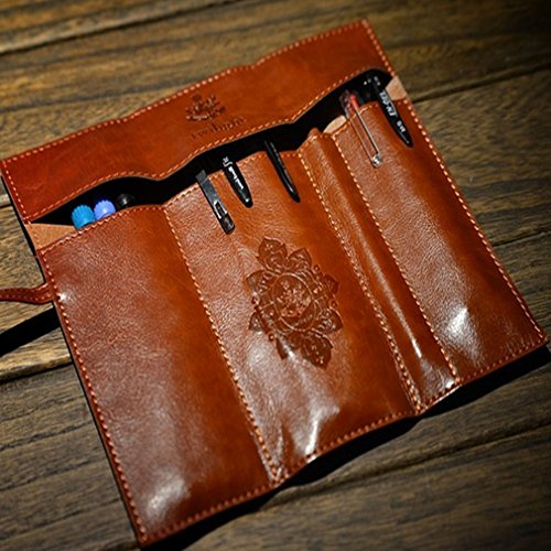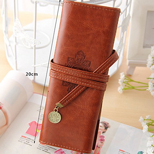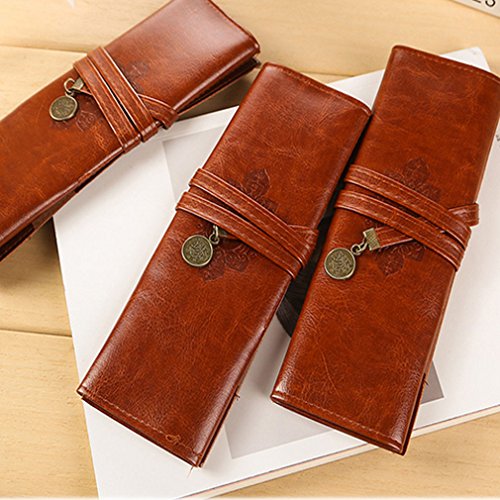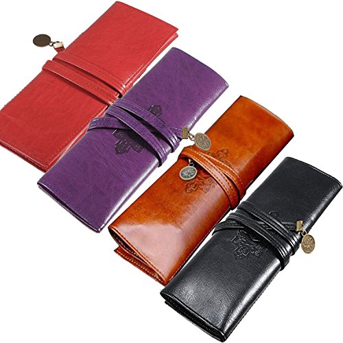 lotusflowert Vintage Style Rollup Pencil Case, Pencil Bag, Pen Pocket - PU Leather( Brown purple red black)