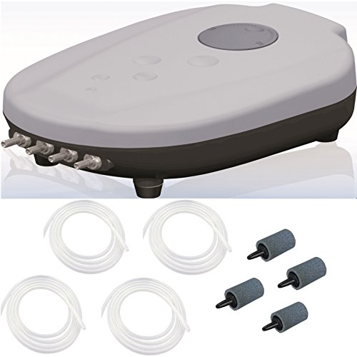 - Includes air pump, integrated manifold, 4 pcs 30’ black vinyl tubing, 4 air stones