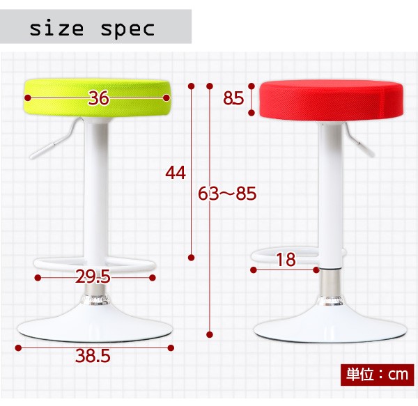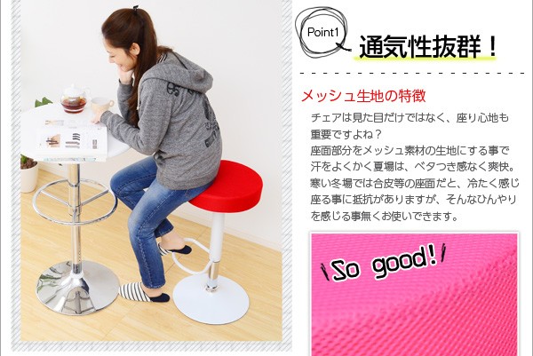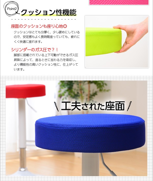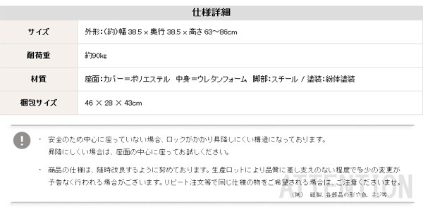 【商品について】■サイズ:外寸:(約)幅38.5×奥行き38.5×高さ63~85cm■カラー:ブラック レッド ピンク ホワイト ブルー ライトグリーン■素材:材質:(本体)スチール、(座面カバー)ポリエステル(メッシュ)座部中身:ウレタンフォーム塗装:粉体塗装■その他:・生産国:中国・お客様組立商品です ※メーカー直送品、商品代引き不可