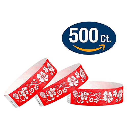 500 RED HAWAIIAN FLOWER 3/4 INCH TYVEK WRISTBANDS FROM WRISTCO - The 500 wristbands are packaged in sheets of ten. Each wristband measures 3/4 inches wide by 10 inches long and will fit most wrists. Each armband is numbered for security and identification.