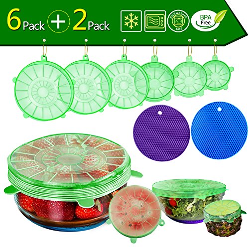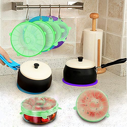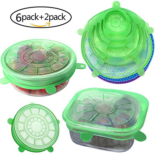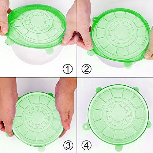 FEATURES AND BENEFITS The COOLEST, most VERSATILE lid set you will ever find! 1.?They are circular in shape but pliable enough to seal even odd-shaped containers.You will find a size that fits all your mugs, pots, cups and bowls.They are also fit for food items of many shapes and sizes, not just circular items. 2.?FDA Approved, non toxic, BPA free ,food-grade silicone ,so don't worry. 3.?They are microwave and dishwasher-safe,also freezer safe. 4.?They are also heat-resistant to 450 F, so reheating foods is never a problem.? 5.?Save on expensive, disposable plastic wrap, and save money on food bills by storing scrumptious leftovers for another meal! You get 6 container covers: (1) 2.6" (will stretch to 3.5") ??-?Small yogurts, fruit cups, ½ an onion or apple, can of soup, cat or dog food, that glass of wine you didn't want to finish, a glass of milk. (2) 3.7" (will stretch to 5")-?Large yogurts, Sour Cream,grapefruit, coffee mug, small bowls, beer mug. (3) 4.5" (will stretch to 6")?-?½ a cantaloupe, regular bowls, small Tupper ware dishes, bento boxes 1-quart paint can. (4) 5.7"(will stretch to 8")?- ½ a?small?watermelon, mixing bowls,?soup bowls. (5) 6.5" (will stretch to 9") - Extra large bowls, ½ of a giant watermelon, mixing bowls. (6) 8.3" (will stretch to 11").- Large?salad?bowl, Cuisinart mixing bowl 1-gallon, Instant pot.
